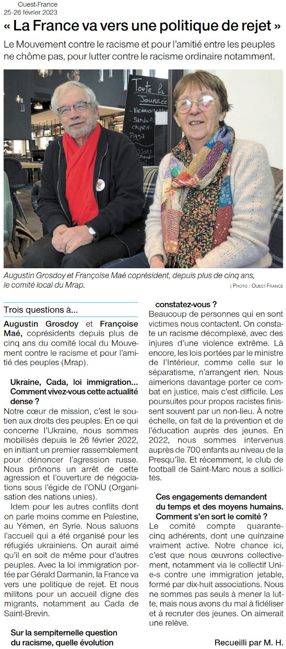 Le samedi 25 février 2023, le comité du MRAP de la région nazairienne a tenu son assemblée générale annuelle, et réaffirmé son engagement contre le racisme et les discriminations.