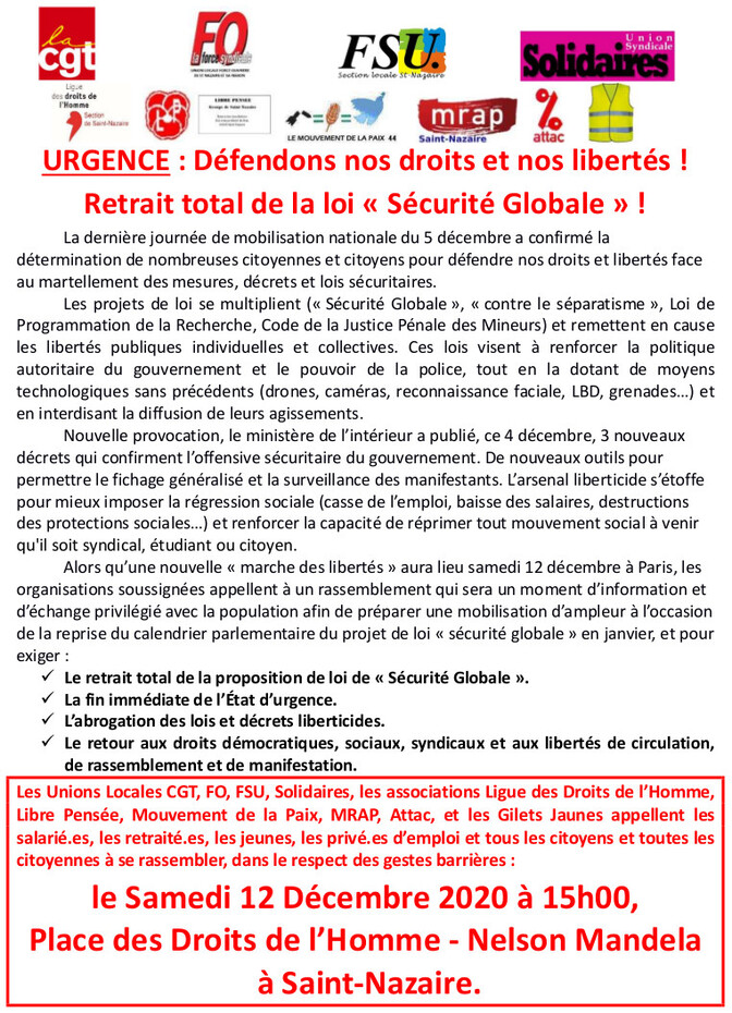 Accueil > Vivre ensemble > Défendons nos droits et libertés ! Retrait total de la loi "Sécurité Globale"