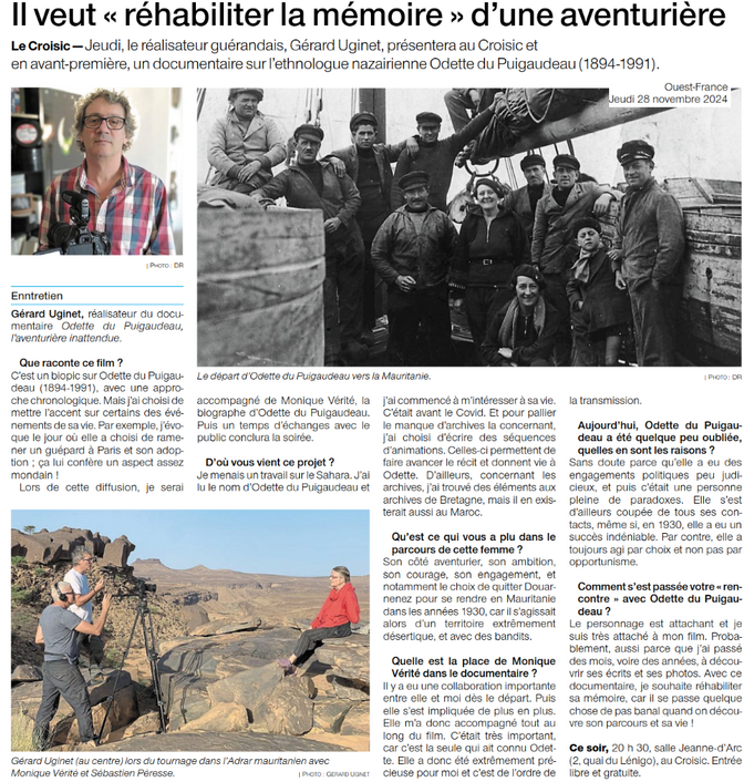 Mardi 19 novembre, Documentaire « Odette du Puigaudeau, l’aventurière inattendue " de Gérard Uginet, à 20 h 30, au Cinéville, payant, réservation et informations sur le site du Cinéville