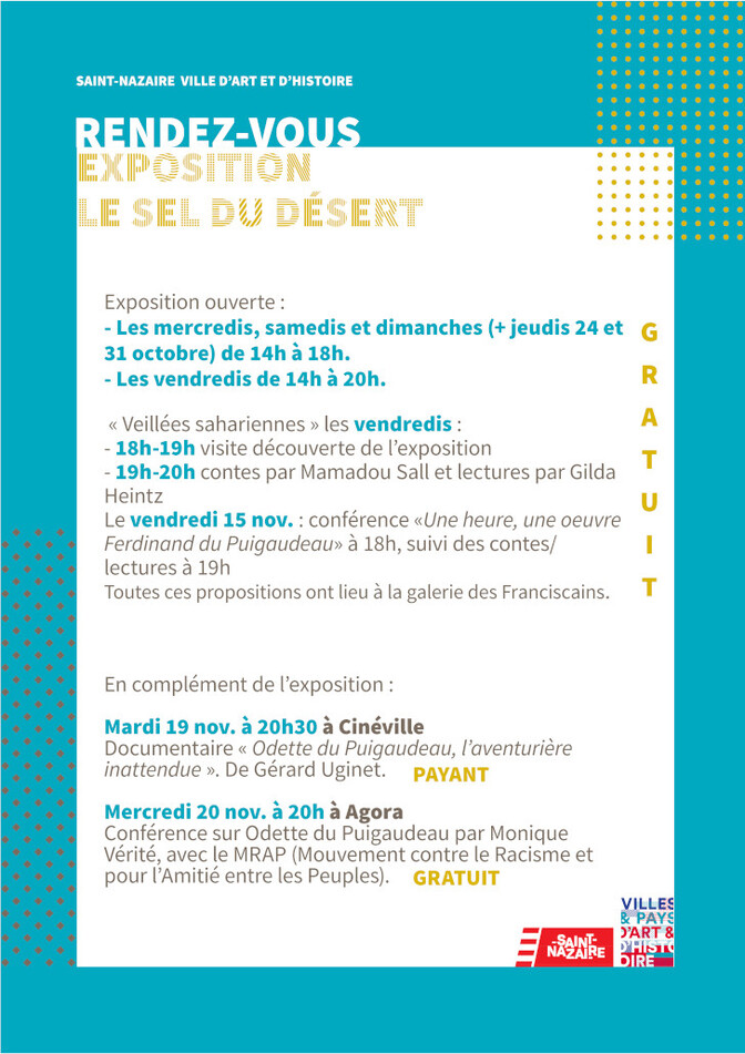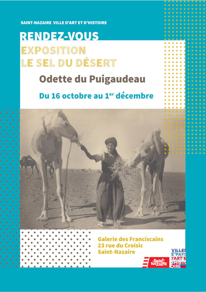 A partir du 16 octobre, découvrez l’exposition Sel du Désert, qui retrace le parcours de l’exploratrice nazairienne Odette du Puigaudeau, et met en valeur ses 3 voyages en Mauritanie, dans le Sahara. Retrouvez sur place des objets collectés, mais aussi des dessins et aquarelles. Ses recherches ont transmis un patrimoine signifiant sur l’exploration et la recherche saharienne.