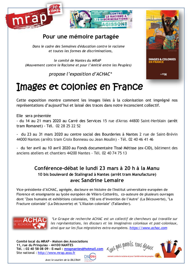 Dans le cadre des Semaines d’Éducation contre le racisme et toutes les formes de discriminations, le comité de Nantes du MRAP organise une conférence-débat le lundi 23 mars avec Sandrine Lemaire, vice-présidente d’ACHAC.