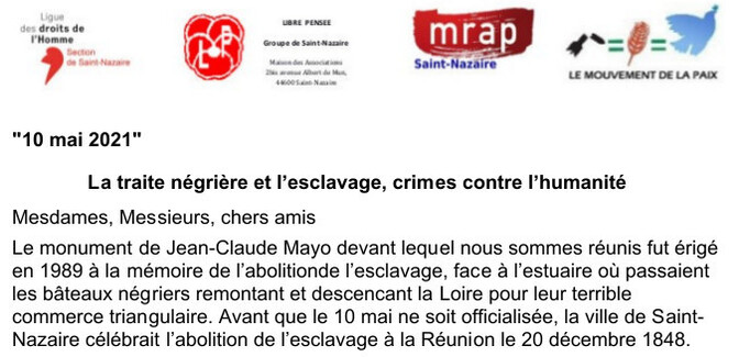 La commémoration officielle de la traite, de l’esclavage et de leurs abolitions a eu lieu, à Saint-Nazaire, ce 21 mai 2021, avec la participation de nombreuses personnalités dont Monsieur Jean-Marc Ayrault, président de la Fondation pour la mémoire de l’esclavage et un public restreint du fait des contraintes sanitaires.