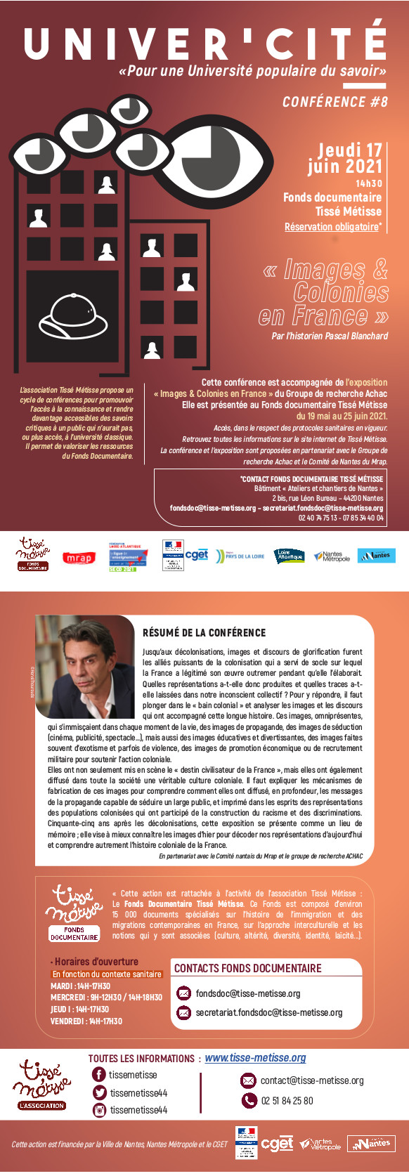 Dans la cadre de l’exposition d’Achac “Images et colonies en France” (jusqu’au 25 juin 2021 inclus), l’historien Pascal Blanchard, un des concepteurs de cette exposition, tiendra une conférence le jeudi 17 juin 2021 à 14 h 30 précises au Fonds documentaire Tissé Métisse, salle 211, bâtiment des anciens ateliers et chantiers, 2bis boulevard Léon Bureau à Nantes. Vous en trouverez l’Invitation et le résumé en pièce jointe.