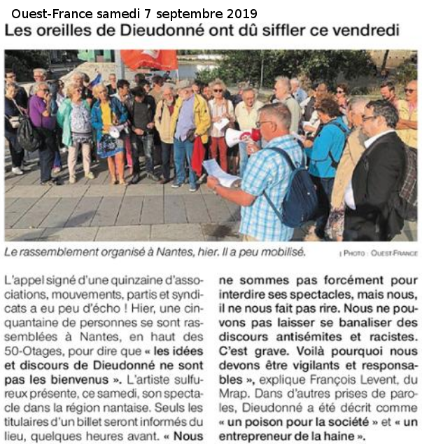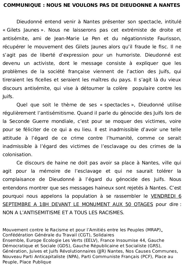 A l’occasion de la venue de Dieudonné dans la région nantaise le 7 septembre pour y donner un spectacle intitulé " Gilets Jaunes", un collectif de 15 organisations, associatives, syndicales et politiques, organise un rassemblement le vendredi 6 septembre à 18h devant le monument aux 50 otages pour dire "Non à l’antisémitisme et à tous les racismes".