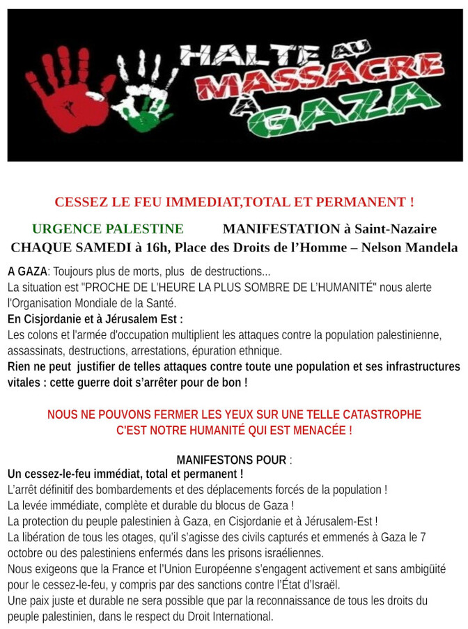 Nous demandons un cessez-le-feu immédiat à Gaza, la fin des bombardements, des offensives terrestres et des déplacements forcés de populations, ainsi que la levée immédiate du blocus. Nous exigeons que la France s’engage activement dans ce sens.