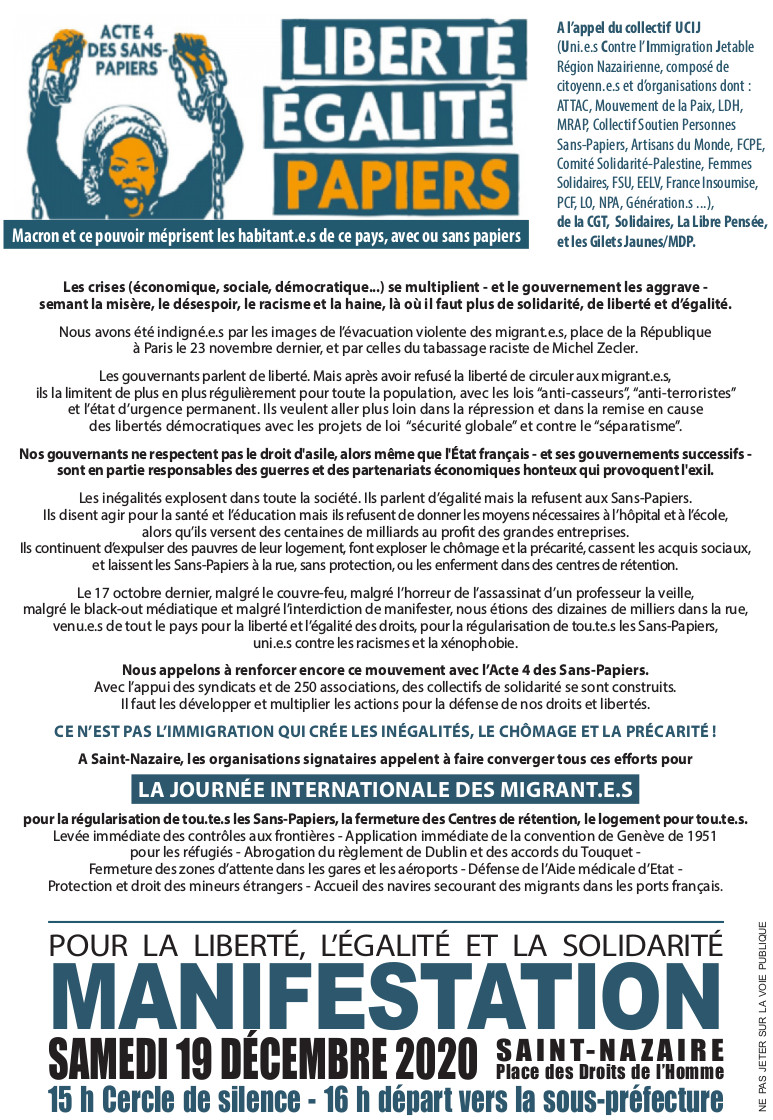 A l’appel du collectif UCIJ, de la CGT, Solidaires, la Libre Pensée, le Gilets jaunes/MDP, pour la journée internationale des migrants