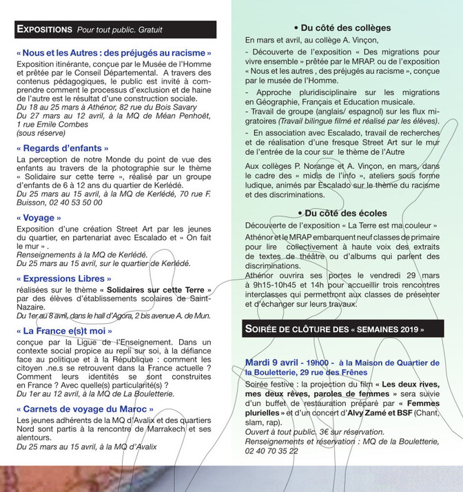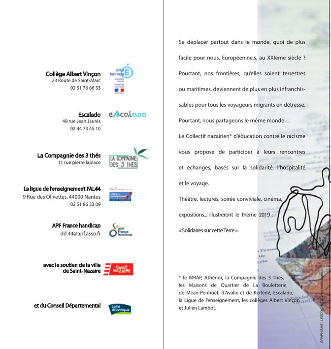 * le MRAP, Athénor, la Compagnie des 3 Thés, les Maisons de Quartier de La Bouletterie, de Méan-Penhoët, d’Avalix et de Kerlédé, Escalado, la Ligue de l’enseignement FAL44, les collèges Albert Vinçon et Julien Lambot.