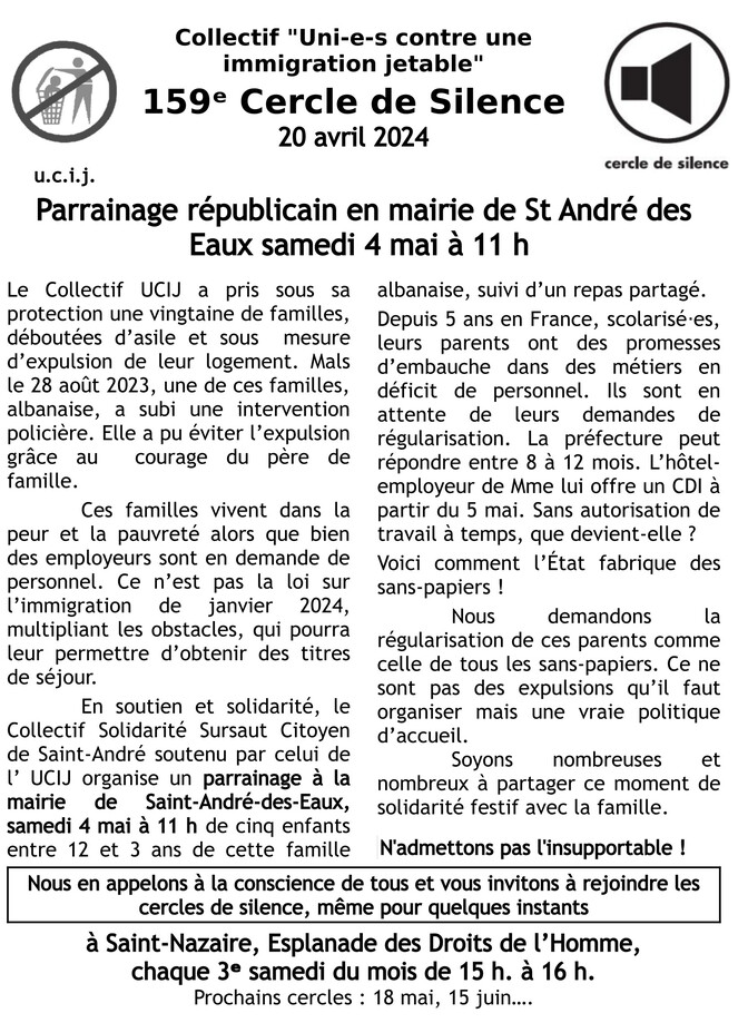[UCIJ] 159è cercle de silence : Parrainage républicain en mairie de St André des Eaux samedi 4 mai à 11 h