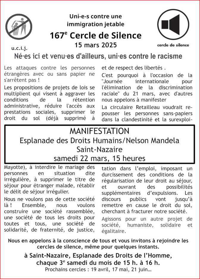 [UCIJ] 167è cercle de silence : Né·es ici et venu·es d’ailleurs, uni·es contre le racisme