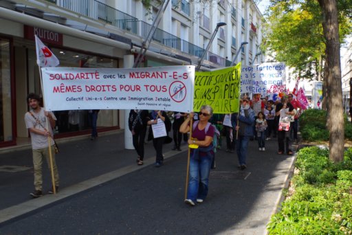 Le cortège s’est ensuite dirigé vers la sous – préfecture en scandant des slogans pour une véritable solidarité internationale. A mi-chemin du parcours, une seconde prise de parole au nom du CSPSP (collectif de soutien aux personnes sans papiers) a expliqué la réalité des migrant-e-s déjà présent-e-s à St-Nazaire, leurs difficultés pour pouvoir s’installer librement dans notre ville et y vivre décemment. Enfin, à la sous-préfecture une dernière prise de parole concernait la lettre que l’UCIJ a envoyé au président de la République pour lui signifier nos revendications. La veille, une délégation avait été reçue par le cabinet du sous-préfet auquel cette lettre avait été remise.