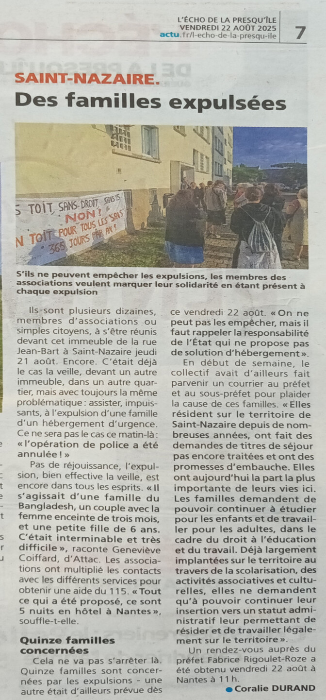 Sur la Communauté d’Agglomération nazairienne, une quinzaine de familles hébergées en logement pour demandeur d’asile se sont vues signifier leur expulsion prochaine avec intervention des forces de l’ordre, par la préfecture de Loire-Atlantique.