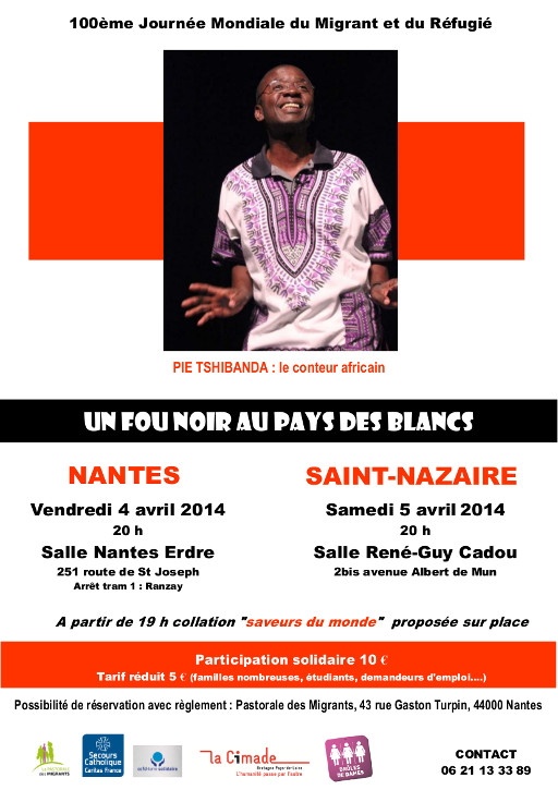 Pour prolonger le 100ème anniversaire de la Journée Mondiale du Migrant et du Réfugié, le CCFD-Terre Solidaire, la Cimade, la Pastorale des Migrants et le Secours Catholique de Loire Atlantique vous invitent au spectacle de PIE TSHIBANDA :