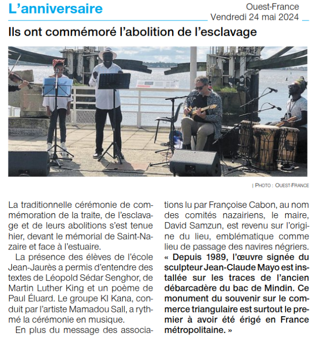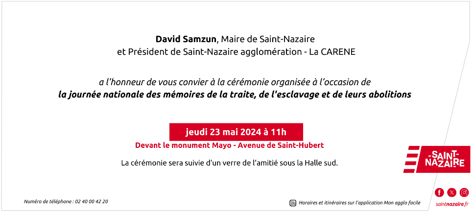 A l’invitation de Monsieur le Maire de Saint-Nazaire, la cérémonie des mémoires de la traite, de l’esclavage et de leurs abolitions se tiendra le jeudi 23 mai à 11h devant le monument de Jean-Claude Mayo.