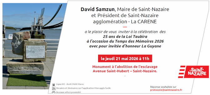 A l’invitation de Monsieur le Maire de Saint-Nazaire, la cérémonie des mémoires de la traite, de l’esclavage et de leurs abolitions se tiendra le jeudi 21 mai à 11h devant le monument de Jean-Claude Mayo.