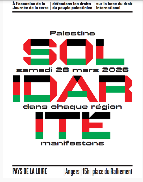 Le 28 mars sera une journée nationale de mobilisation aux cotés des Palestiniens. Retrouvons-nous toutes et tous partout en France le 28 mars, à l’occasion de la Journée de la Terre, pour exiger la paix en Palestine !