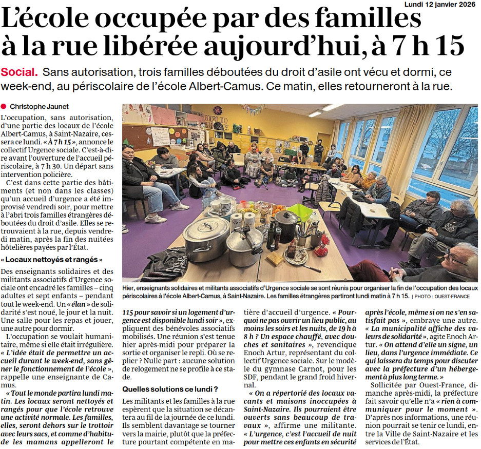 Ouest France : L’école occupée par des familles à la rue sera libérée, lundi à 7 h 15, à Saint-Nazaire