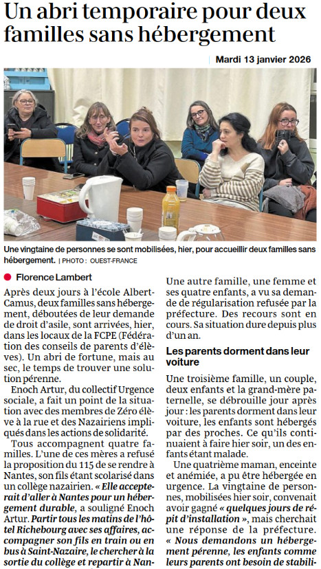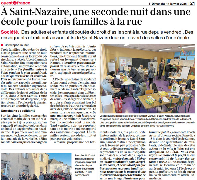 Ouest France : Plusieurs familles sans logement dorment dans une école occupée sans autorisation à Saint-Nazaire depuis vendredi soir