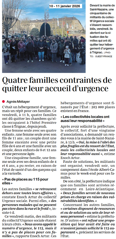Ouest France : À Saint-Nazaire, quatre familles contraintes de quitter leur hébergement d’urgence