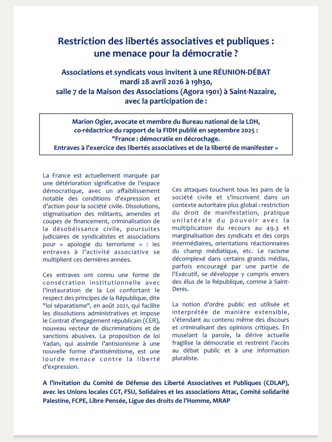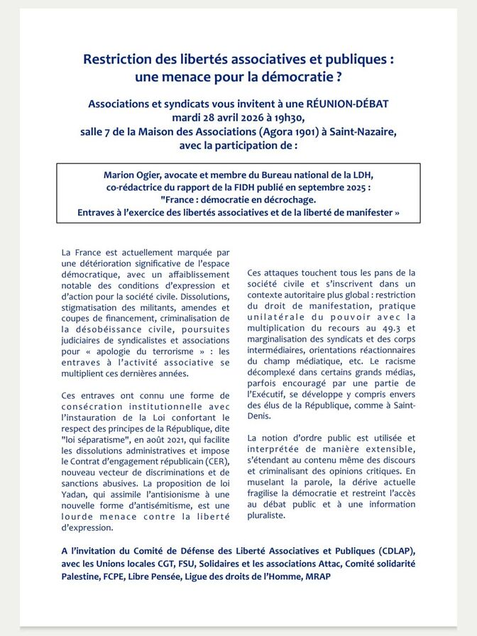 Associations et syndicats vous invitent à une RÉUNION-DÉBAT mardi 28 avril à 19h30, salles 7, Maison des Associations (Agora 1901)