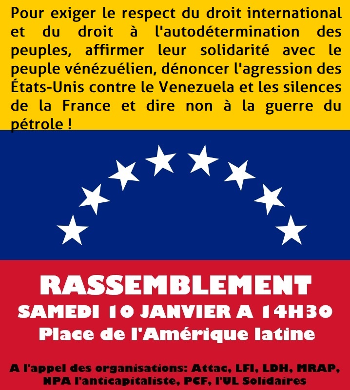 Les organisations suivantes : Attac Saint-Nazaire la Presqu’île et le Pays de Retz, La France insoumise, La Ligue des droits de l’Homme Saint-Nazaire Estuaire Presqu’île (LDH), le Mouvement contre le Racisme et l’Amitié entre les Peuples (MRAP), le NPA l’anticapitaliste, le Parti Communiste Français, l’UL Solidaires appellent à un rassemblement samedi 10 janvier à 14H30 place de l’Amérique latine à Saint-Nazaire pour exiger le respect du droit international et du droit à l’autodétermination des peuples, affirmer leur solidarité avec le peuple vénézuélien, dénoncer l’agression des États-Unis contre le Venezuela et les silences de la France et dire non à la guerre du pétrole.